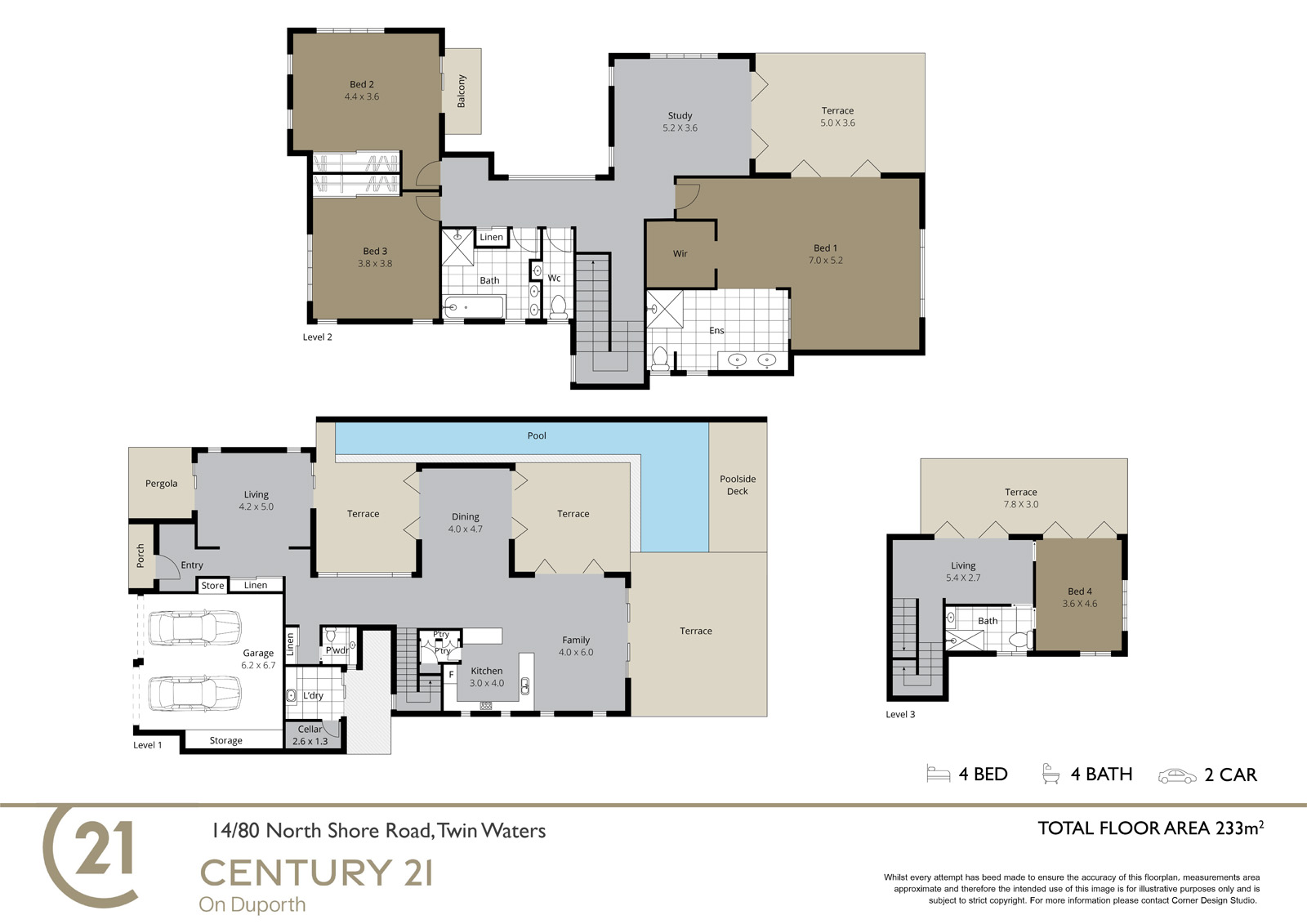 Offers another wonderful option for a main bedroom or guest suite. A fourth bedroom with private ensuite, study nook at the top of the stairs and access to a private balcony running the length of the upper level on the northern side of the home.